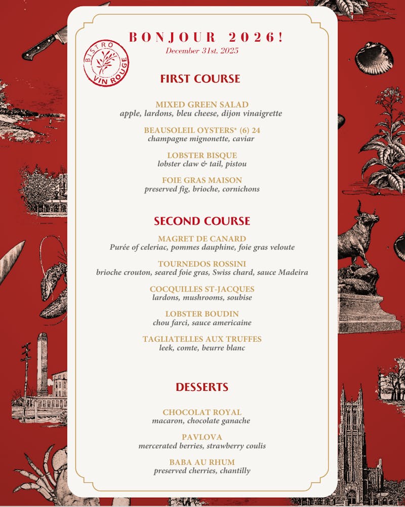 Ring in the New Year with your friends and family at Vin Rouge! Chef Steve McRae has put together a spectacular a la carte menu for this evening, blending classic Bistro dishes with fine French cuisine. We will be uncorking special Champagne to celebrate the year that was and the one that is to come.
