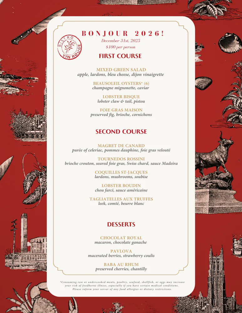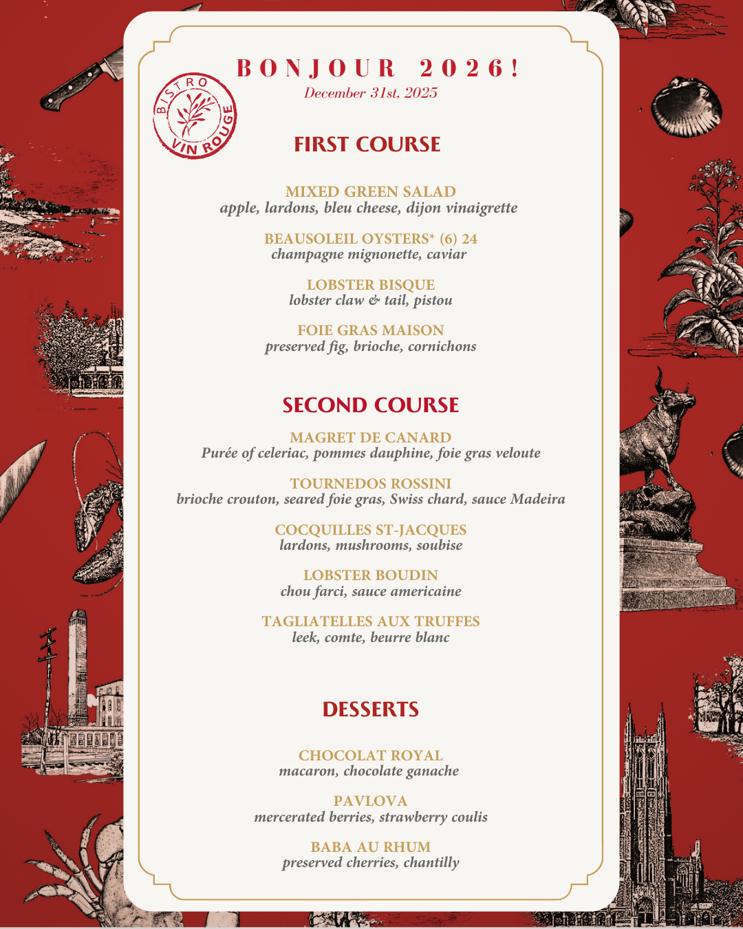 Ring in the New Year with your friends and family at Vin Rouge! Chef Steve McRae has put together a spectacular a la carte menu for this evening, blending classic Bistro dishes with fine French cuisine. We will be uncorking special Champagne to celebrate the year that was and the one that is to come.